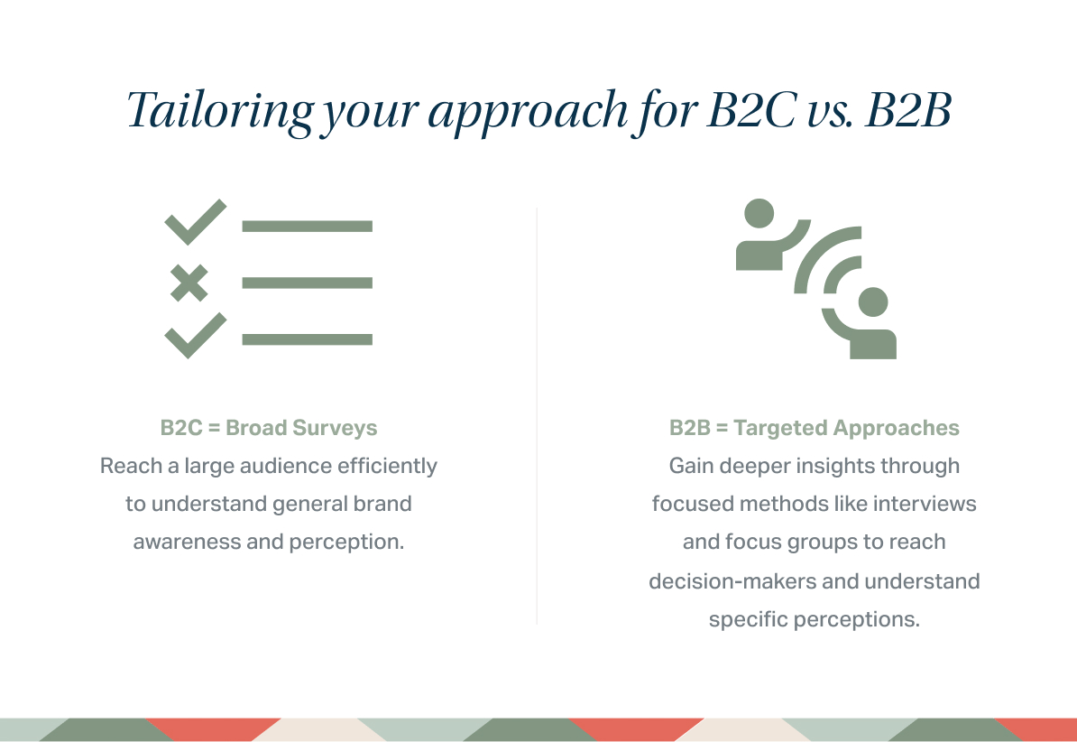 The approach to assessing brand awareness varies by industry. For B2C industries, broad surveying is possible. For B2B industries, a more targeted approach may be needed, such as Voice of the Customer interviews, focus groups, or other high touch options.
