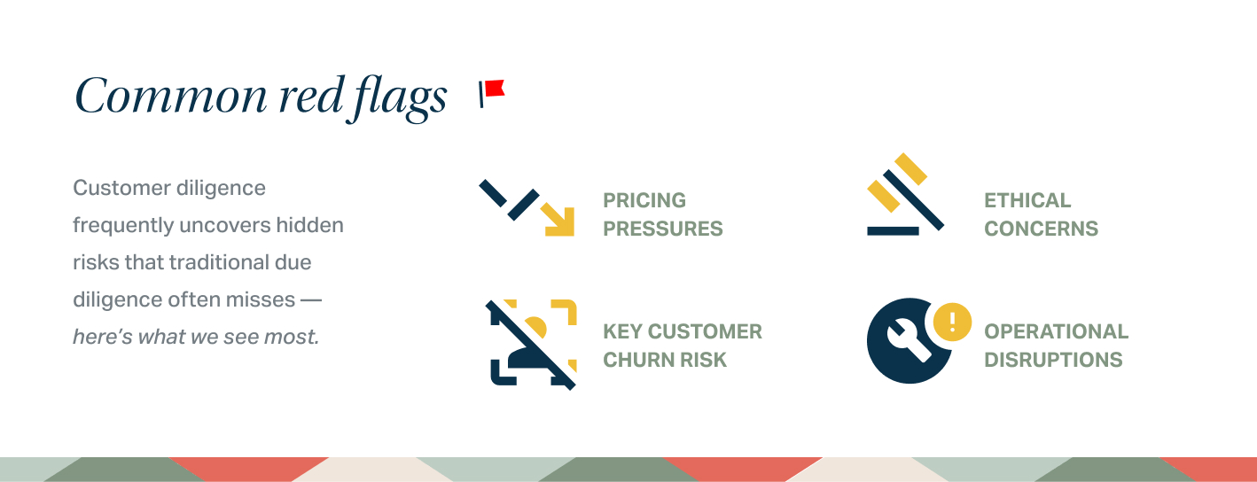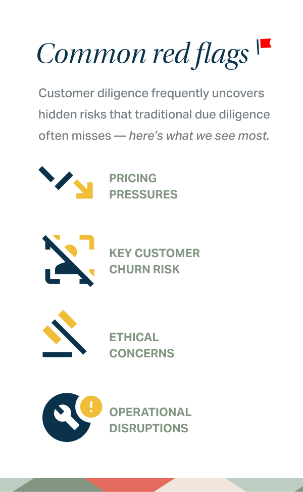 1 in 11 deals we evaluate uncovers red flags that change a valuation or stop an acquisition in its tracks—whether it's a potential loss of key customers, a failing product, ethical concerns, or emergent pricing pressures.