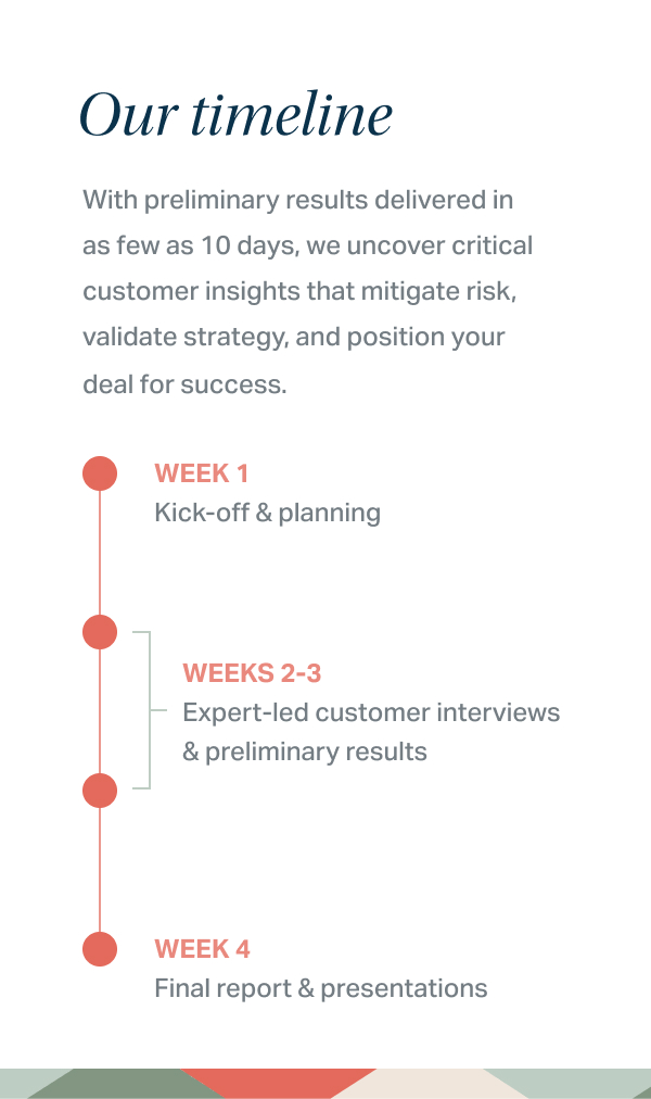 While commercial diligence evaluates market size, trends, and competition, it barely scratches the surface of customer relationships. Our customer interviews, however, reveal what's driving loyalty, where the cracks are forming, and predicts growth potential at the account level.