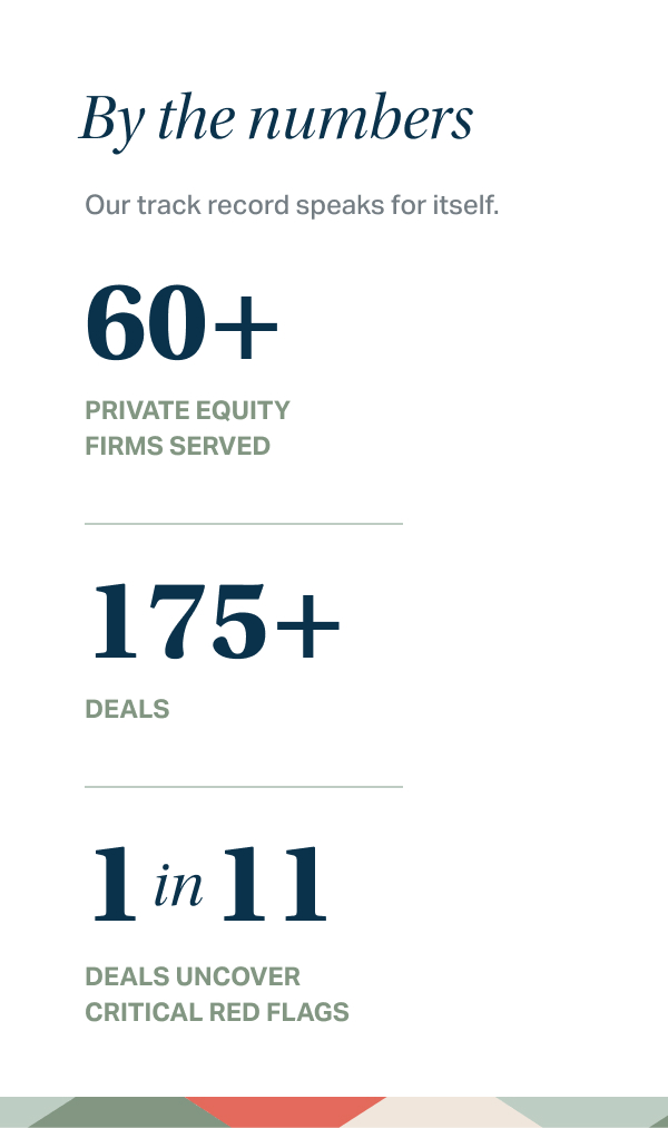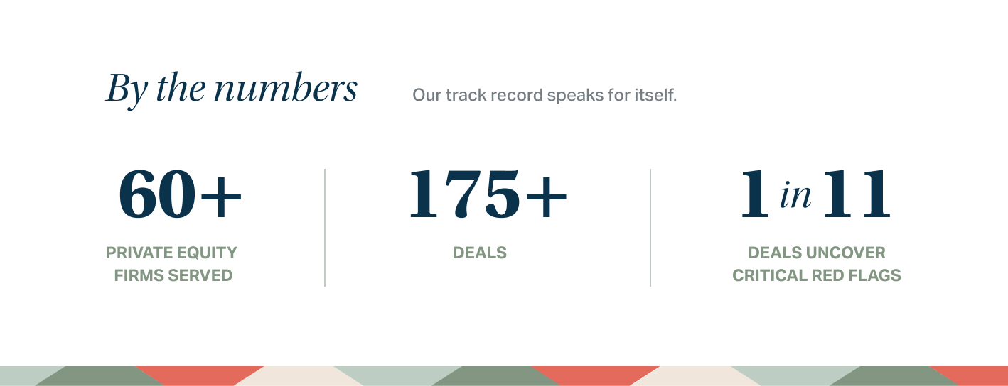 With 60+ private equity firms served by our core team and 175+ deals under our belts, we uncover the truths that financials and commercial diligence can't.